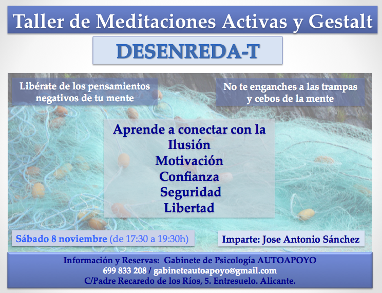 No te dejes atrapar por la red de pensamientos negativos de tu mente, descubre los cebos-trampa que tus tendencias de personalidad te ponen para impedirte estar relajado/a y ser tu mismo/a, libérate de los autoboicots jugando, bailando, saltando y sintiendo quién eres de verdad. Aprende a desconectar de tu mente negativa y conectar con tu ilusión, motivación, confianza, seguridad, libertad, ….
