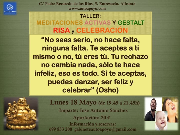 «No seas serio, no hace falta, ninguna falta. Te aceptes a ti mismo o no, tú eres tú. Tu rechazo no cambia nada, sólo te hace infeliz, eso es todo. Si te aceptas, puedes danzar y ser feliz y celebrar. Si no te aceptas, te vuelves serio y tenso. De modo que lo importante no es si quieres aceptarte o no, sino si quieres ser feliz o infeliz….¿Por qué digo que la felicidad es la única alquimia? Porque en tu felicidad fluyes, tu energía no está congelada, no estás bloqueada. Tienes una danza interior de energía, una energía dinámica que se necesita para la transformación. Cuando eres infeliz, eres insulso, aburrido, como una roca, nada fluye, todo está congelado. ¿Cómo vas a cambiar? ¡De modo que no seas serio!» Osho