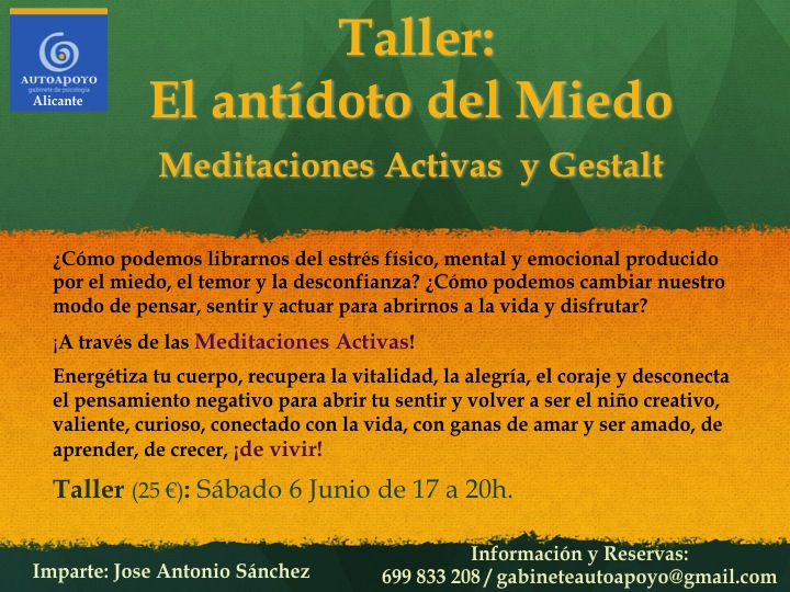 Si quieres experimentar cómo transformar tu miedo y convertirlo en energía creativa puedes venir a nuestro Taller de Meditaciones Activas “El antídoto del miedo” que realizaremos el sábado 6 de junio de 17 a 20h. Precio: 25 €.