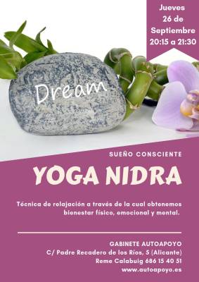 Yoga Nidra es una técnica de meditación, que se traduce en un estado de profunda relajación física, emocional y mental. En este estado podemos mejorar el esquema corporal, la capacidad de concentración, desarrollar la memoria, aumentar el conocimiento, la creatividad, descubrir nuestro potencial interior y reestructurar la mente, entre otros muchos beneficios psico-físicos.